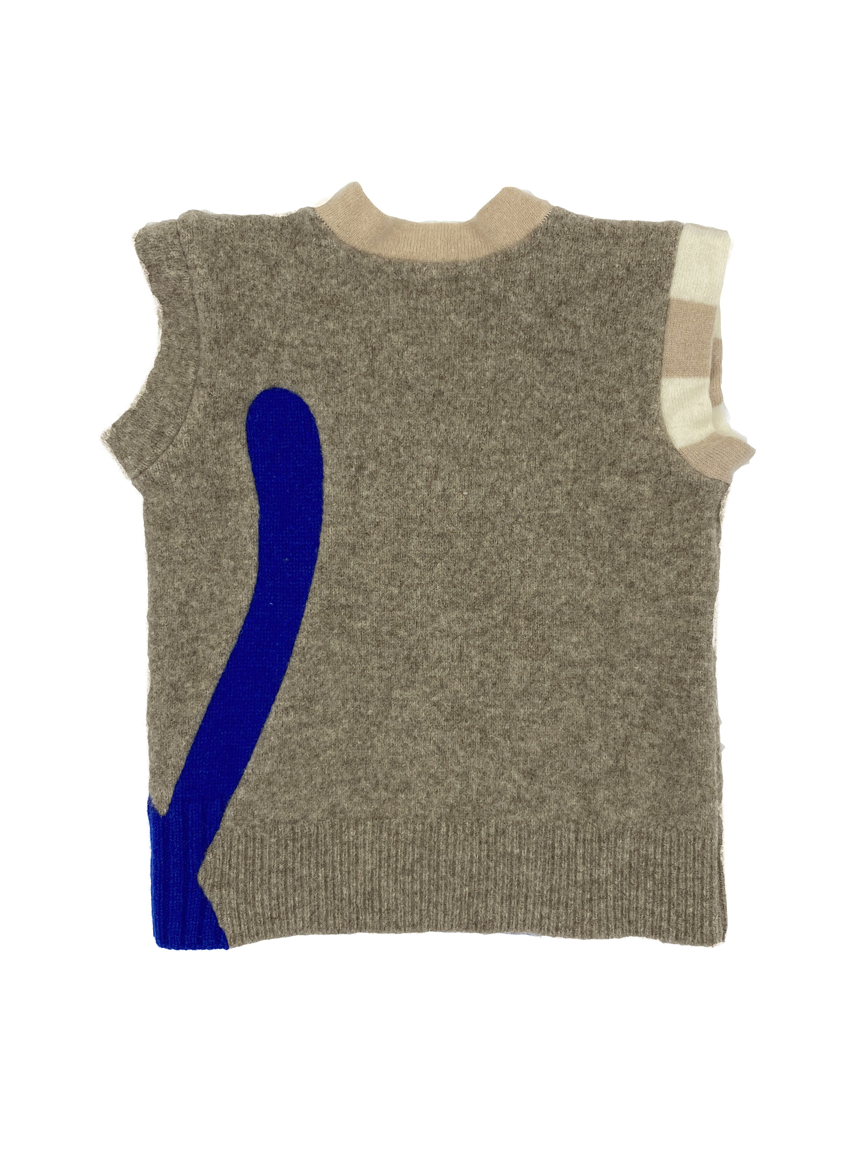 It contains pieces of three different wool sweaters: grey 50% Yak wool / 50% merino wool, blue 80% lambs wool, 20% polyamide and striped 100% cashmere.